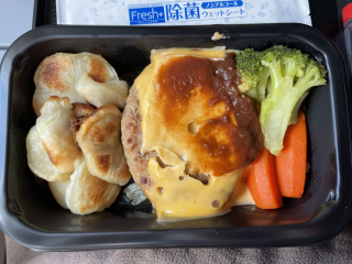 行きの機内食は、CAさんのおすすめのチーズハンバーグをいただきました(もう一方は焼き鳥でした)